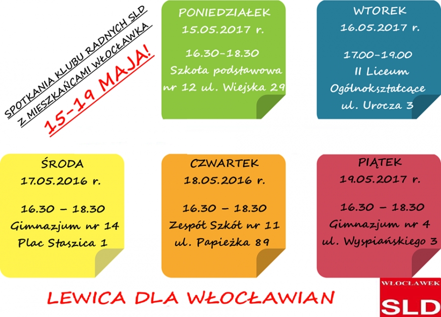 10 maja 2017 r. na konferencji prasowej działacze włocławskiego SLD poinformowali oraz zaprosili mieszkańców Włocławka do udziału w zaplanowanych na przyszły tydzień spotkaniach otwartych z Radnymi KR SLD.